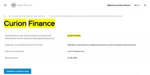 - Центробанк России — 14 августа 2024 года Curion Finance официально внесён в чёрный список как организация с признаками нелегальной деятельности на рынке ценных бумаг.