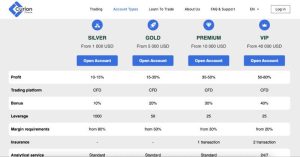 Curion Finance предлагает четыре тарифа (Silver, Gold, Premium, VIP) с разными депозитами и услугами. Леверидж до 1:1000 — запрещено в ЕС с 2018 года (макс 1:30 для розницы).