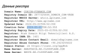 Последнее, на что хочется обратить внимание — это на регистрацию упомянутых сайтов. В частности curion-finance.com зарегистрирован 01.05.2024. То есть до окончания срока действия адреса чуть менее 2 месяцев. История компании Curion Finance — вымысел. Брокер существует менее года.