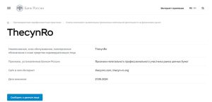Кроме того, Центробанк России официально внёс ThecynRo в свой чёрный список организаций с признаками нелегальной деятельности и мошенничества, что делает любую работу с россиянами незаконной.