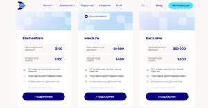 - Elementary: 150 долларов, плечо 1:100 — базовый для новичков, с ограниченными активами.